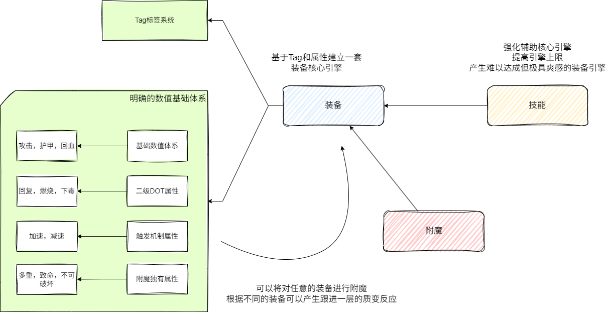 附魔可以对任意一个装备使用,将数值基础体系中的一个属性直接附加在任意装备之上。一个原来造成伤害的武器,现在附魔护甲,造成伤害的同时也会比例带上护甲效果。同时护甲也会收到同类型效果的加持。整个装备引擎会得到质变的提升。