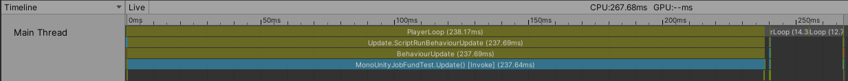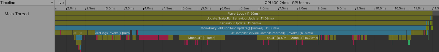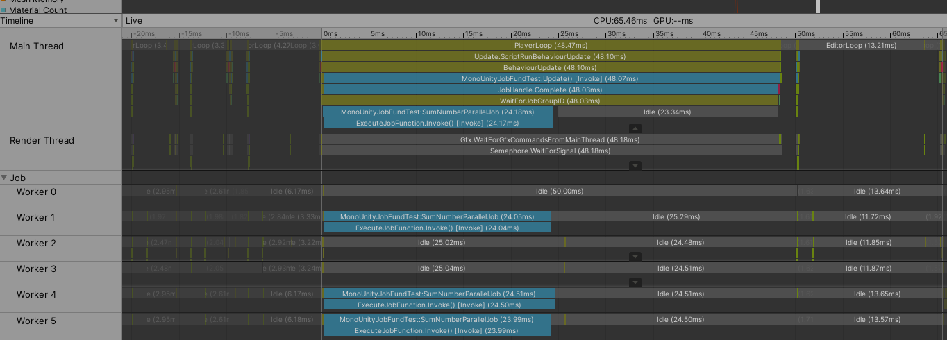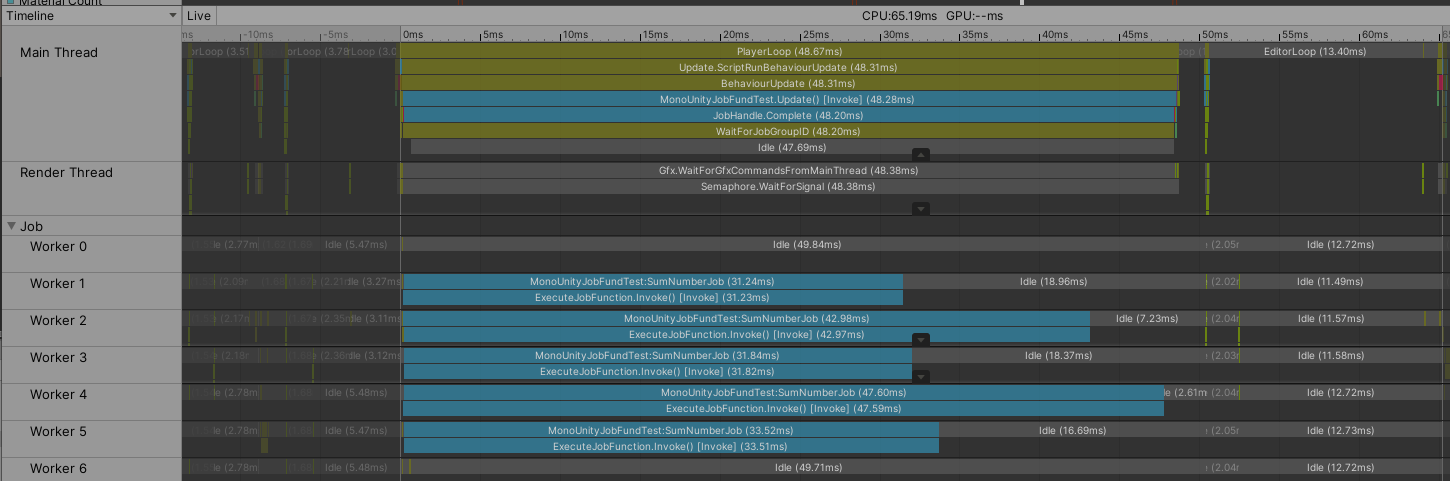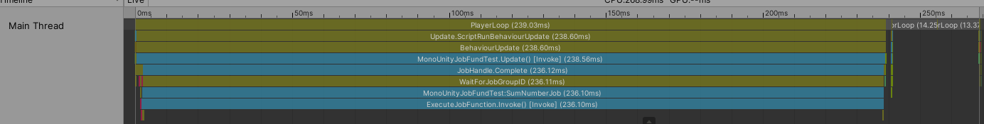 该实现实际上会在当帧内完成计算。因为在主线程函数ScheduleSumNumerJob中直接调用了Complete接口。这个会迫使等待Job计算完成。运行该函数,打开Profiler可以看到如下图。