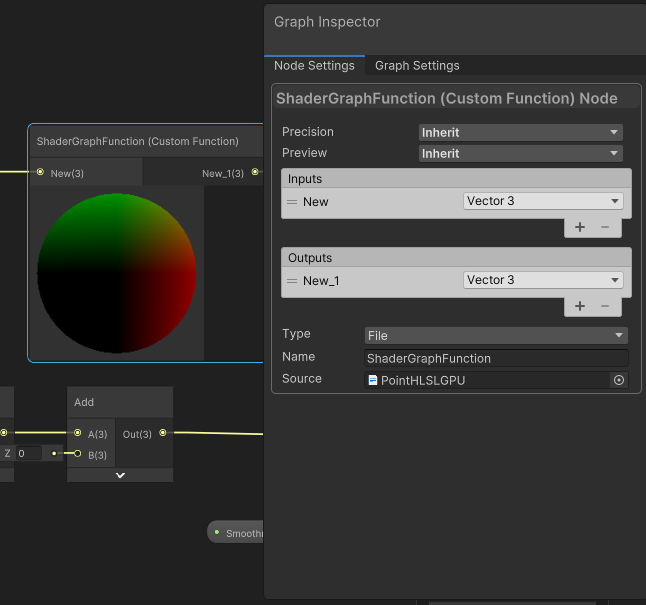 - 然后添加inputs和outputs分别为Vector3,这对应函数参数中的float3。因为我们主要修改目标物体的世界坐标,属于对顶点的世界position进行修改。